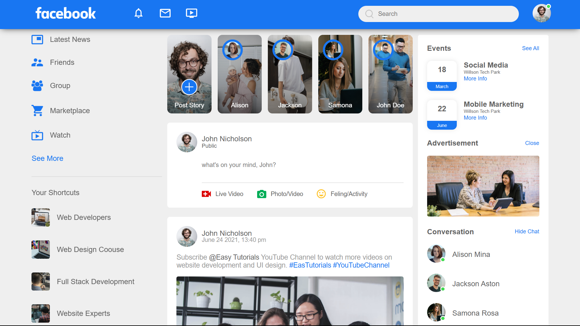 Built a front-end Facebook clone using HTML, CSS, and JavaScript, featuring responsive layouts and interactive UI components.
